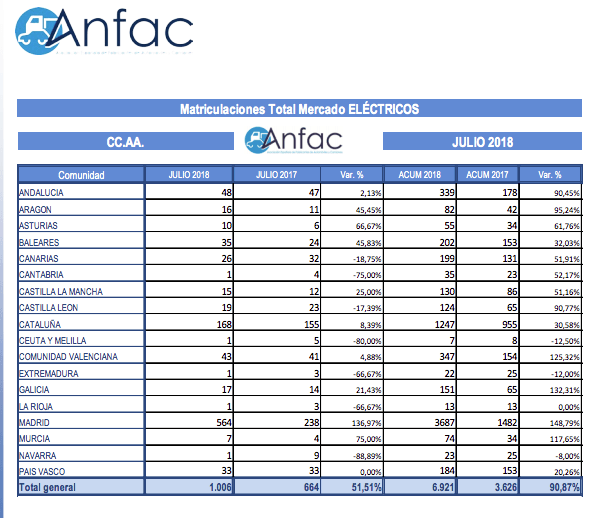 Las entregas de vehículos eléctricos se incrementaron en un 51,5% durante julio, y superan las 1.000 unidades matriculadas en un solo mes. En los primeros siete meses del año, las matriculaciones de estos vehículos vuelven a duplicar las cifras obtenidas entre enero y julio de 2017, pasando de 3.626 unidades vendidas a las 6.921 comercializaciones hasta julio de 2018.