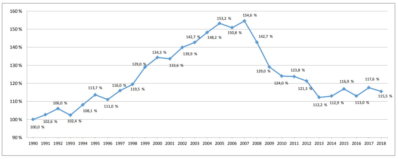| Variación relativa temporal (1990=100%) | 100,0% | 106,0% | 107,2% | 108,3% |