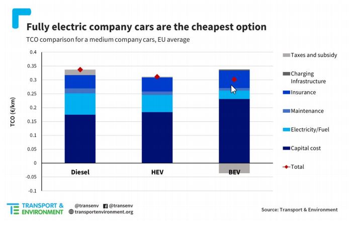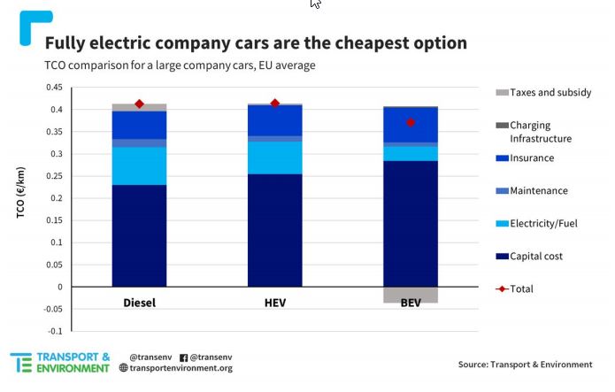 Los coches eléctricos son ya la mejor opción para las flotas corporativas que tienen elevado kilometraje y supuestamente se centran en el coste total de utilización en lugar de mirar solo el precio de compra del vehículo. Sin embargo, la mayoría de coches de empresa siguen siendo contaminantes. ¿Por qué deberían los contribuyentes pagar por los subsidios a coches de empresa contaminantes cuando los coches eléctricos son más baratos de usar?