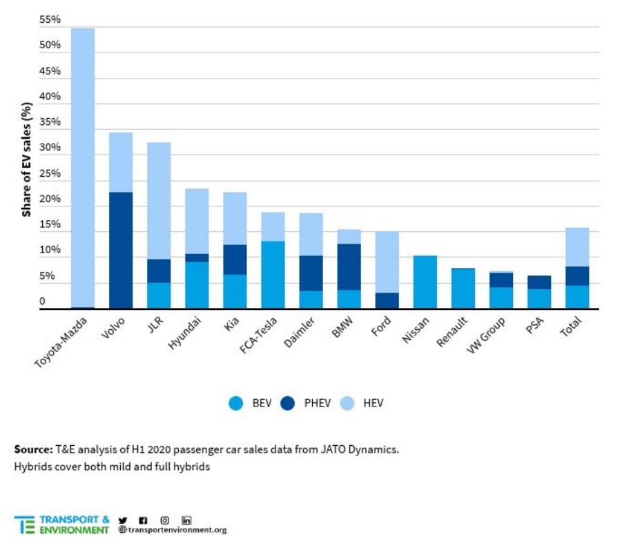 T&E ha calculado la proporción de automóviles eléctricos que se venderán en Europa en 2020 y 2021 a partir de las estrategias de cumplimiento individuales de los fabricantes, que pueden ser: el aumento de ventas de vehículos eléctricos, mejora en la eficiencia en los motores de combustión e hibridaciones, o gracias a los acuerdos de asociación entre grupos.