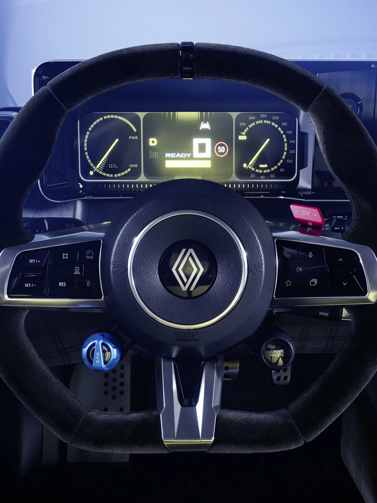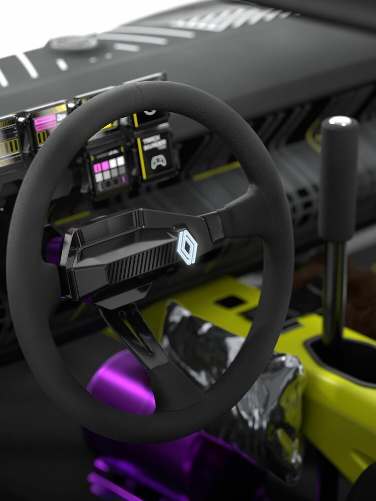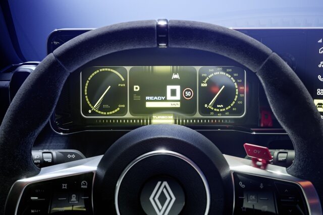 El cuadro muestra los indicadores en un estilo retro claramente inspirado en los del R5 Turbo y Turbo 2, aunque es probable que permita otras configuraciones personalizadas como las que tienen los coches de WRC o la F1, en donde Renault tiene larga experiencia.